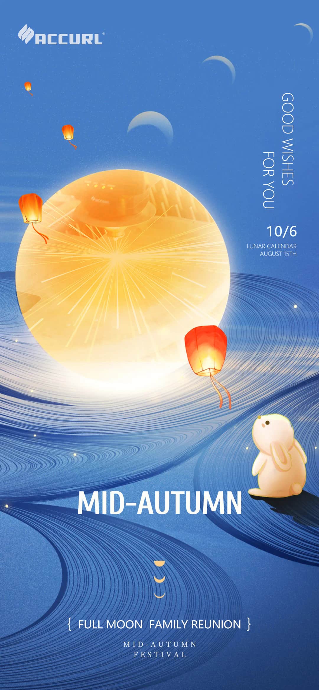 Cari dipendenti e amici di Accurl provenienti da ogni ceto sociale, vi auguriamo di trascorrere una gioiosa Festa di Metà Autunno, di riunirvi alle vostre famiglie e di essere benedetti dalla felicità e dal benessere!